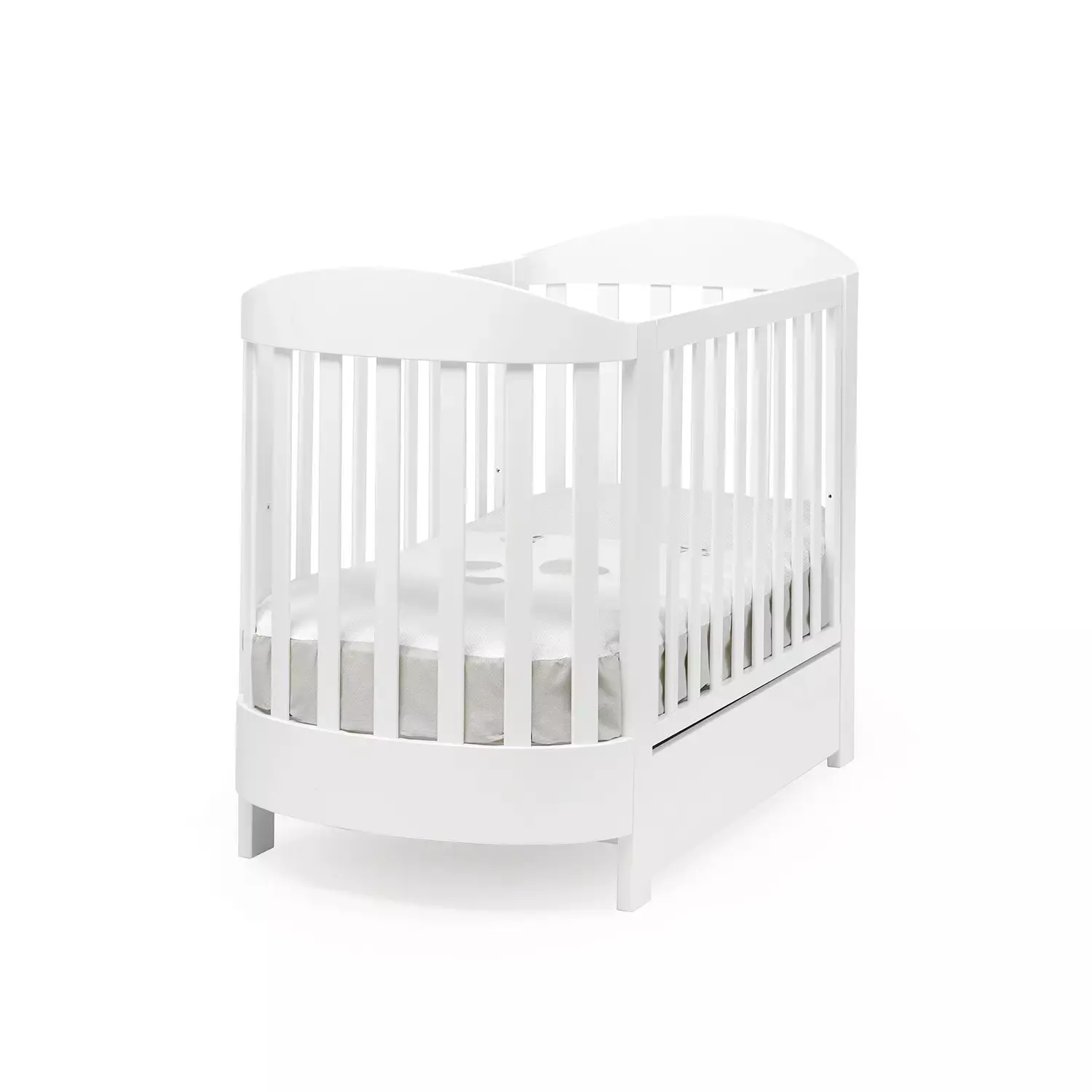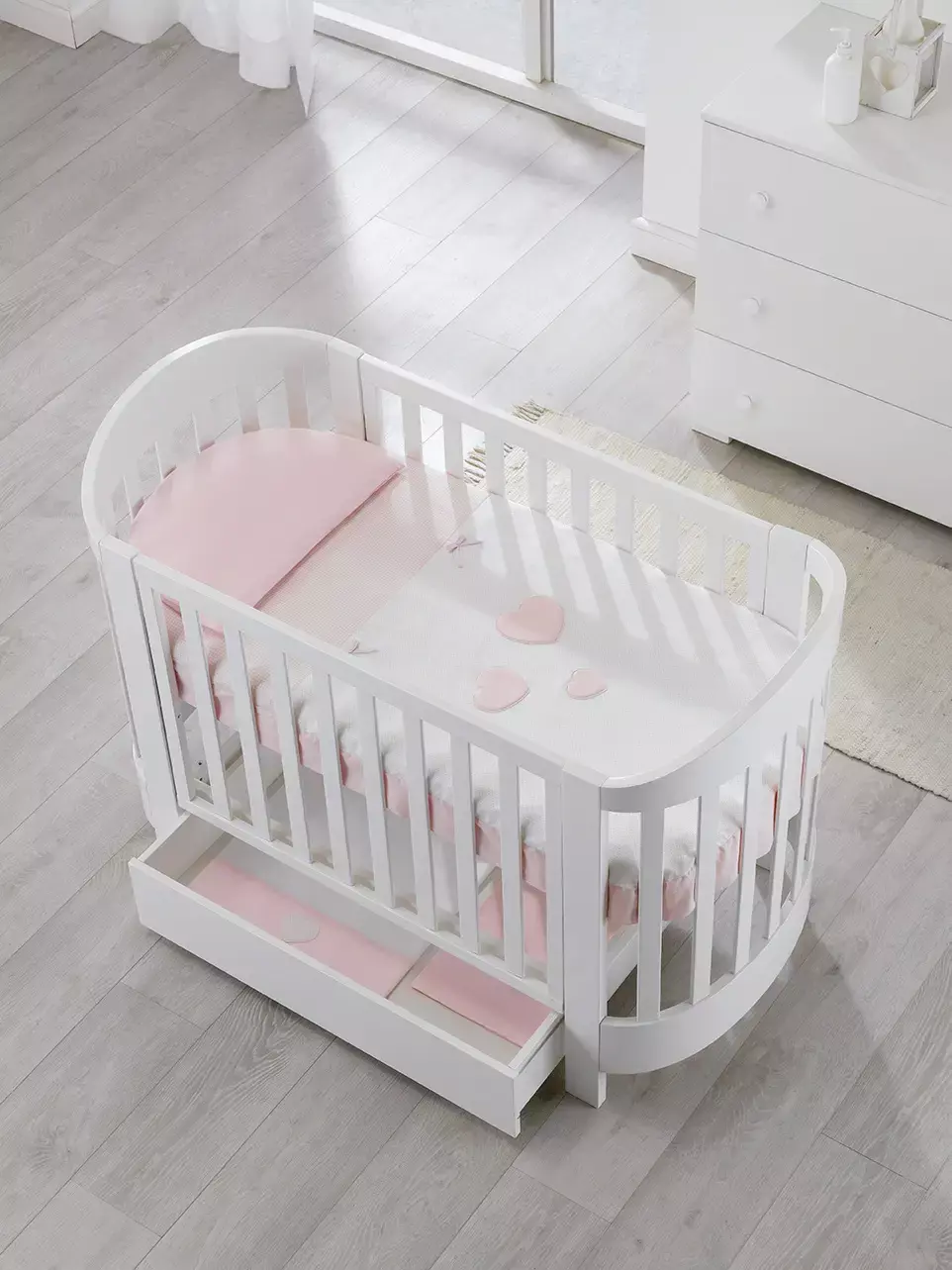 Изготовлена из массива древесины бука .Кроватка овальной формы. Овальный матрас ARIEL входит в комплект кроватки и имеет размеры 128х60.