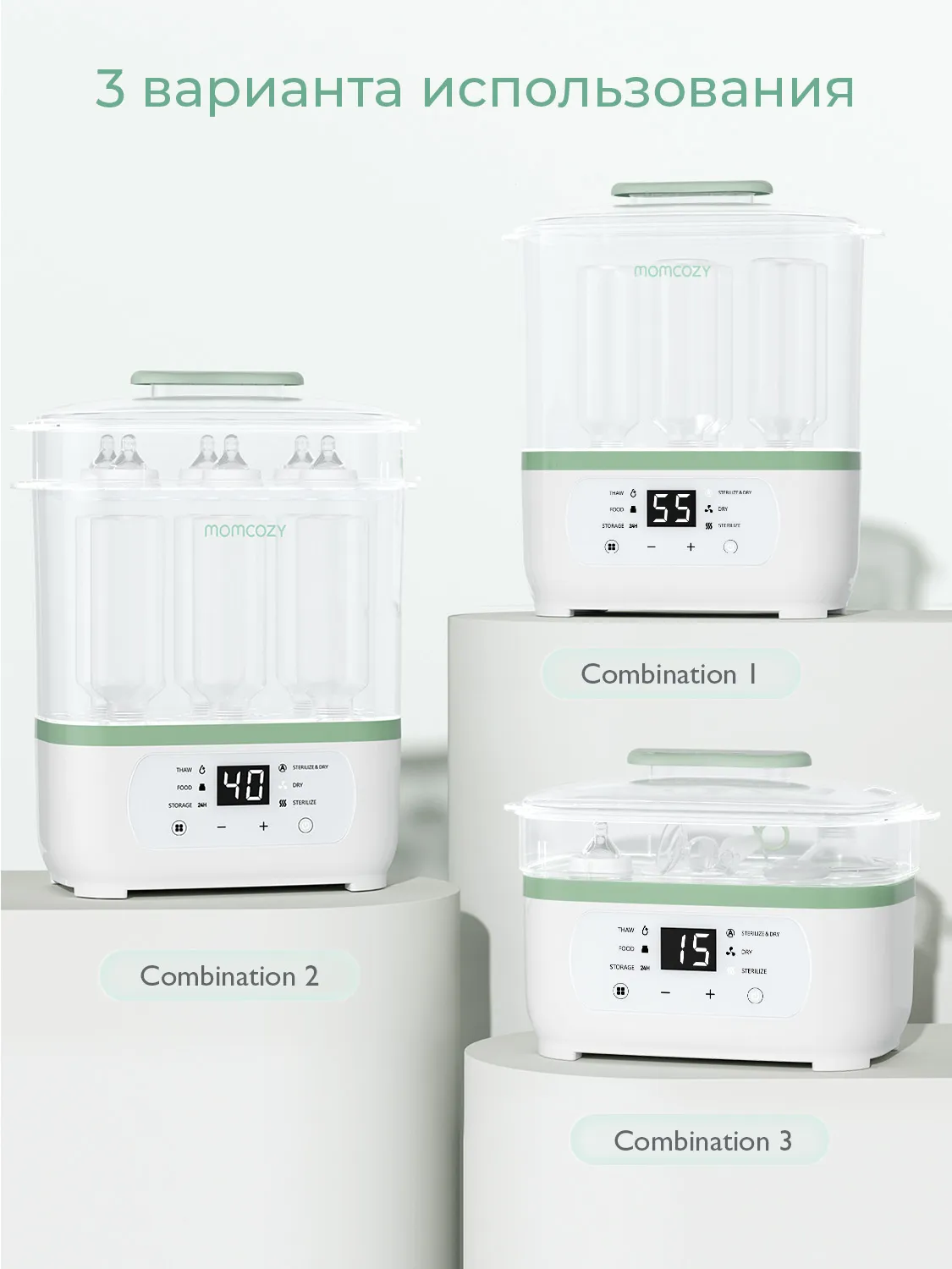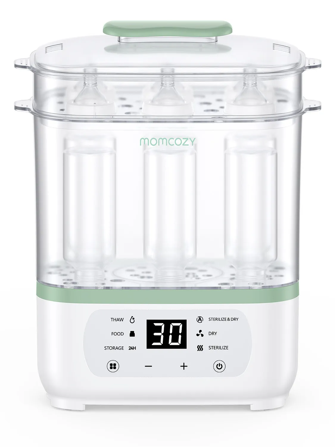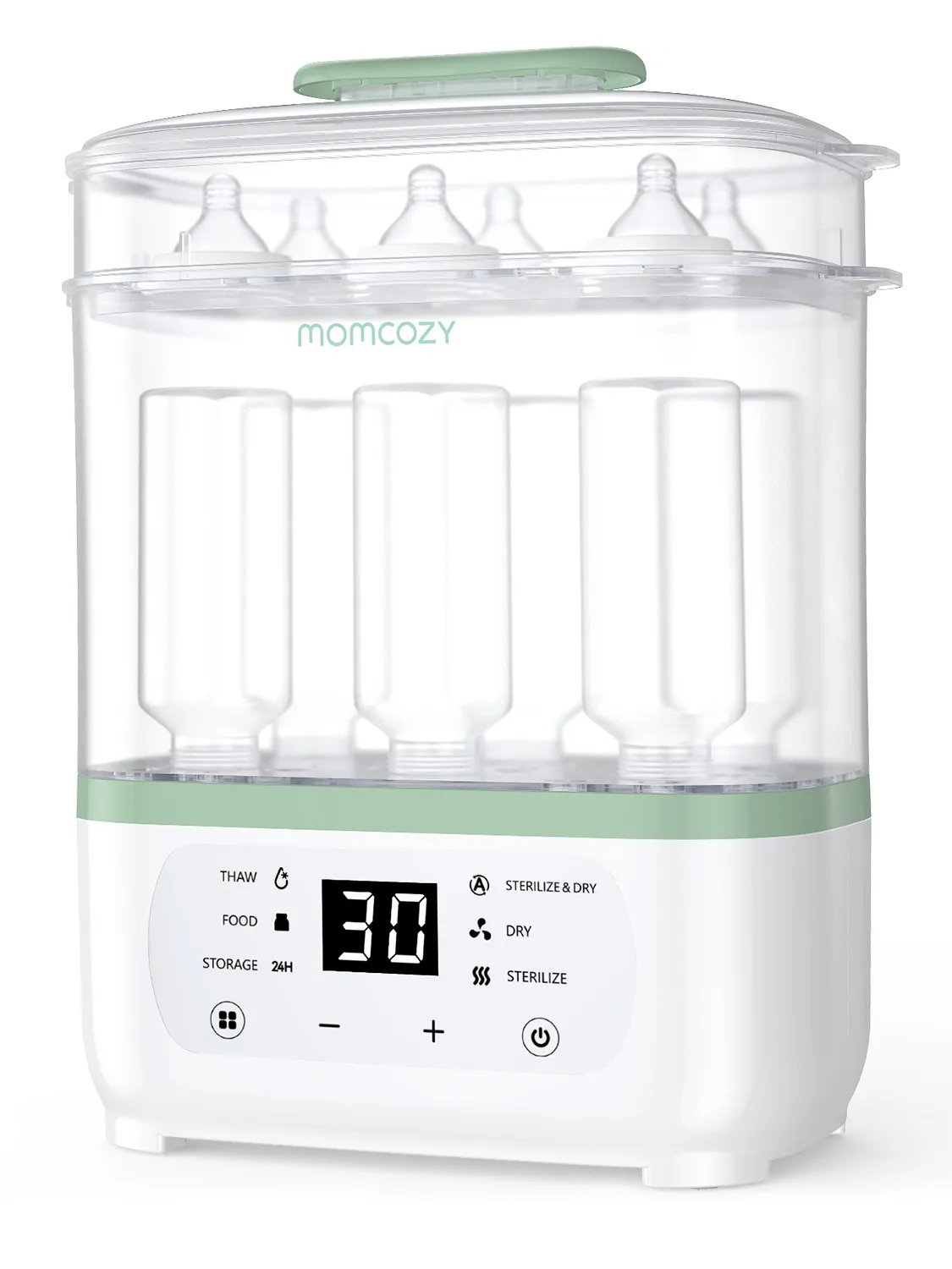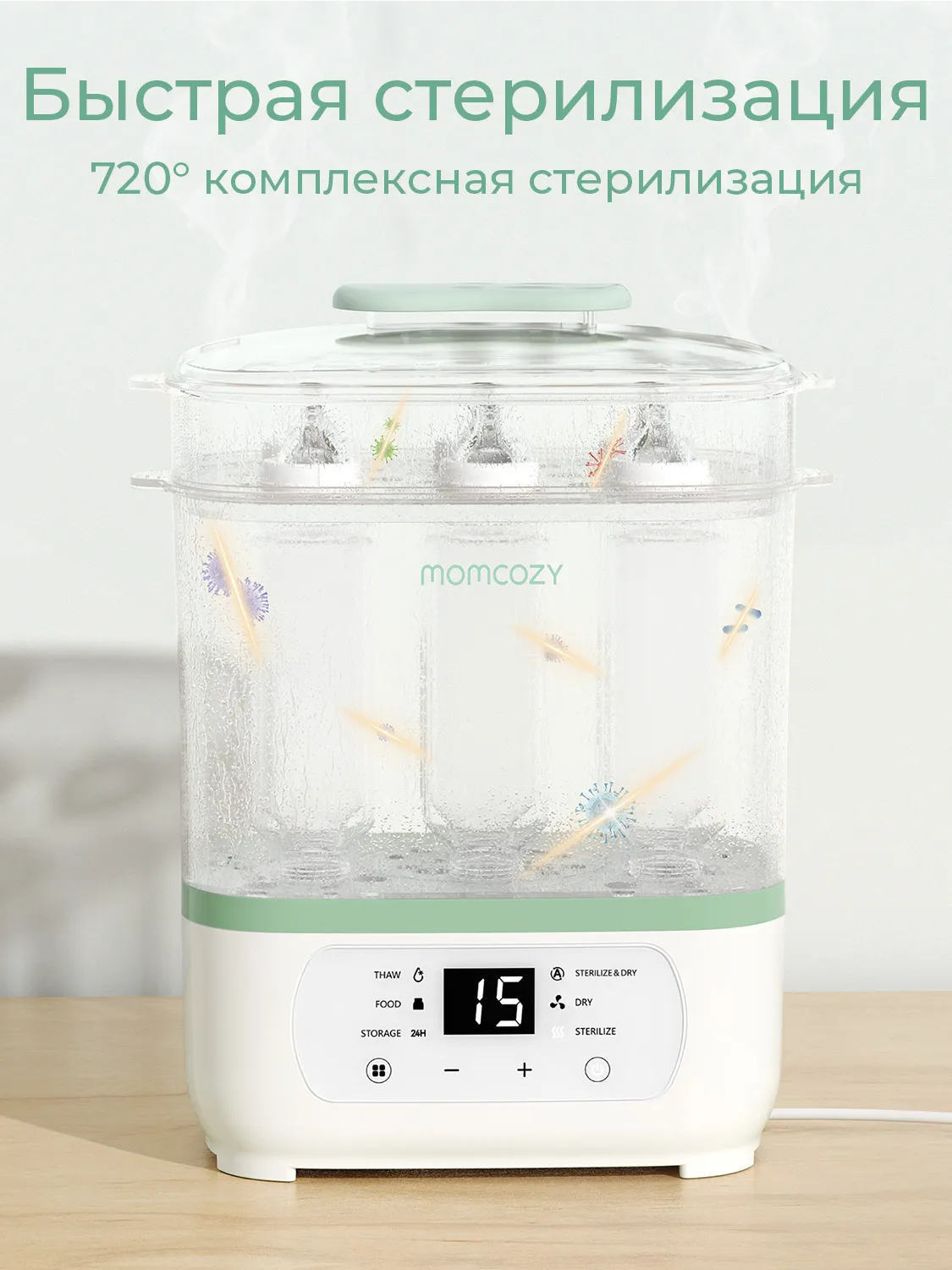 Устройство сочетает функции стерилизации, сушки, подогрева, размораживания и хранения детских бутылочек и принадлежностей. Паровая стерилизация с последующей сушкой гарантирует гигиеничность и защиту от бактерий.