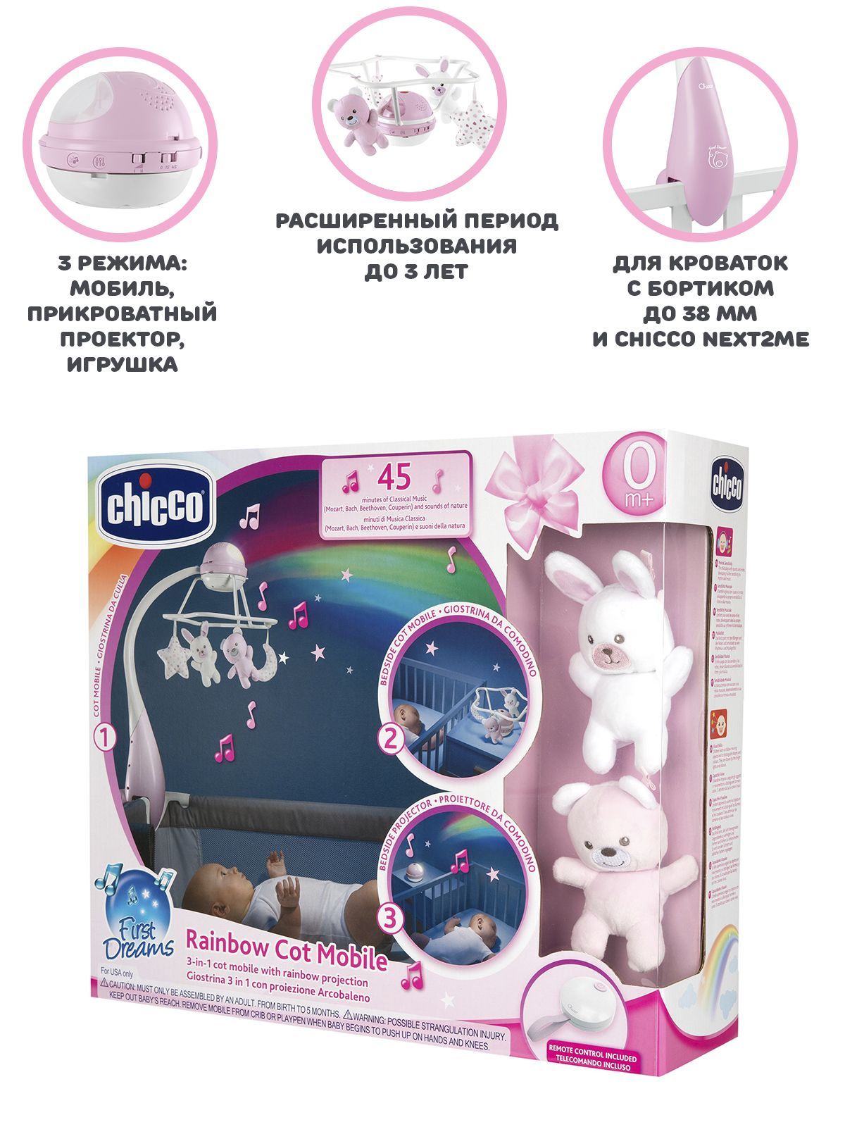 Игрушка-мобиль на кроватку «Радуга» 3 в 1 с дистанционным управлением 0+. Музыкальный проектор воспроизводит классические мелодии и композиции в стиле нью-эйдж, а также звуки природы. 3 конфигурации, благодаря которым игрушка с расширенным периодом использования подойдет как новорожденным, так и подросшим детям: