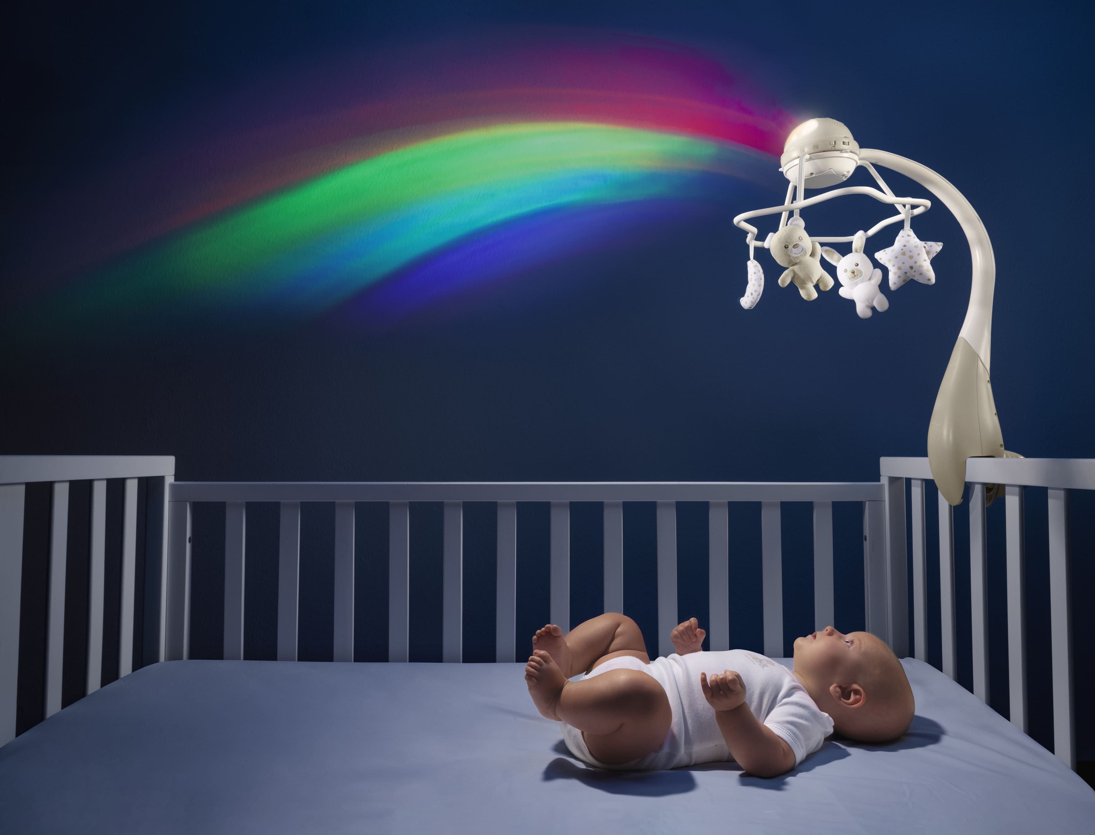 Игрушка-мобиль на кроватку «Радуга» 3 в 1 с дистанционным управлением 0+. Музыкальный проектор воспроизводит классические мелодии и композиции в стиле нью-эйдж, а также звуки природы. 3 конфигурации, благодаря которым игрушка с расширенным периодом использования подойдет как новорожденным, так и подросшим детям: