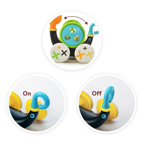 • Когда уточку тянут, она свистит и поет, а подставка на спине утки вращается. Когда утка останавливается, звуки прекращаются, и ваш ребенок может увидеть причинно-следственную связь между действием и следствием.