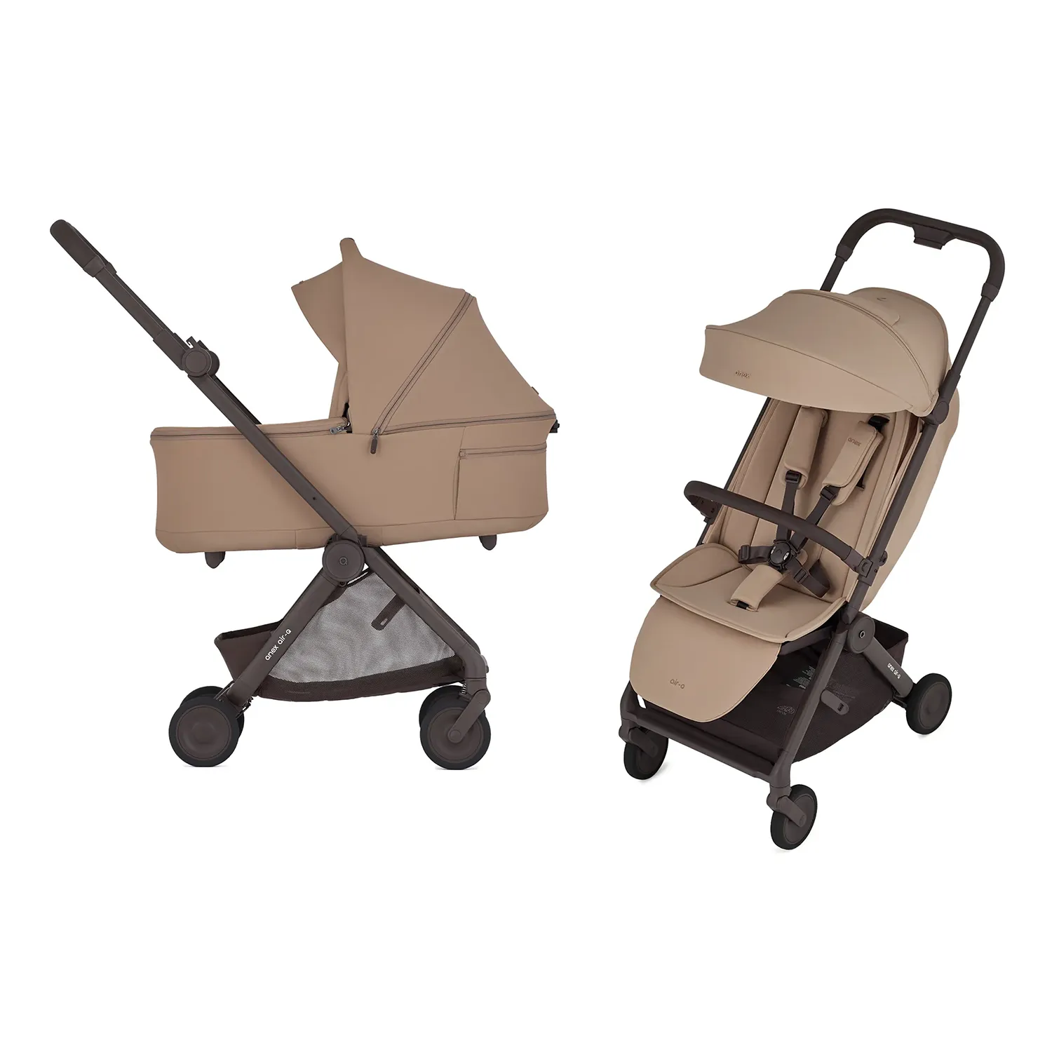 В комплект входит прогулочная коляска Anex Air-Q, люлька Air-Q, бампер для прогулочной коляски, подножка для прогулочной коляски.