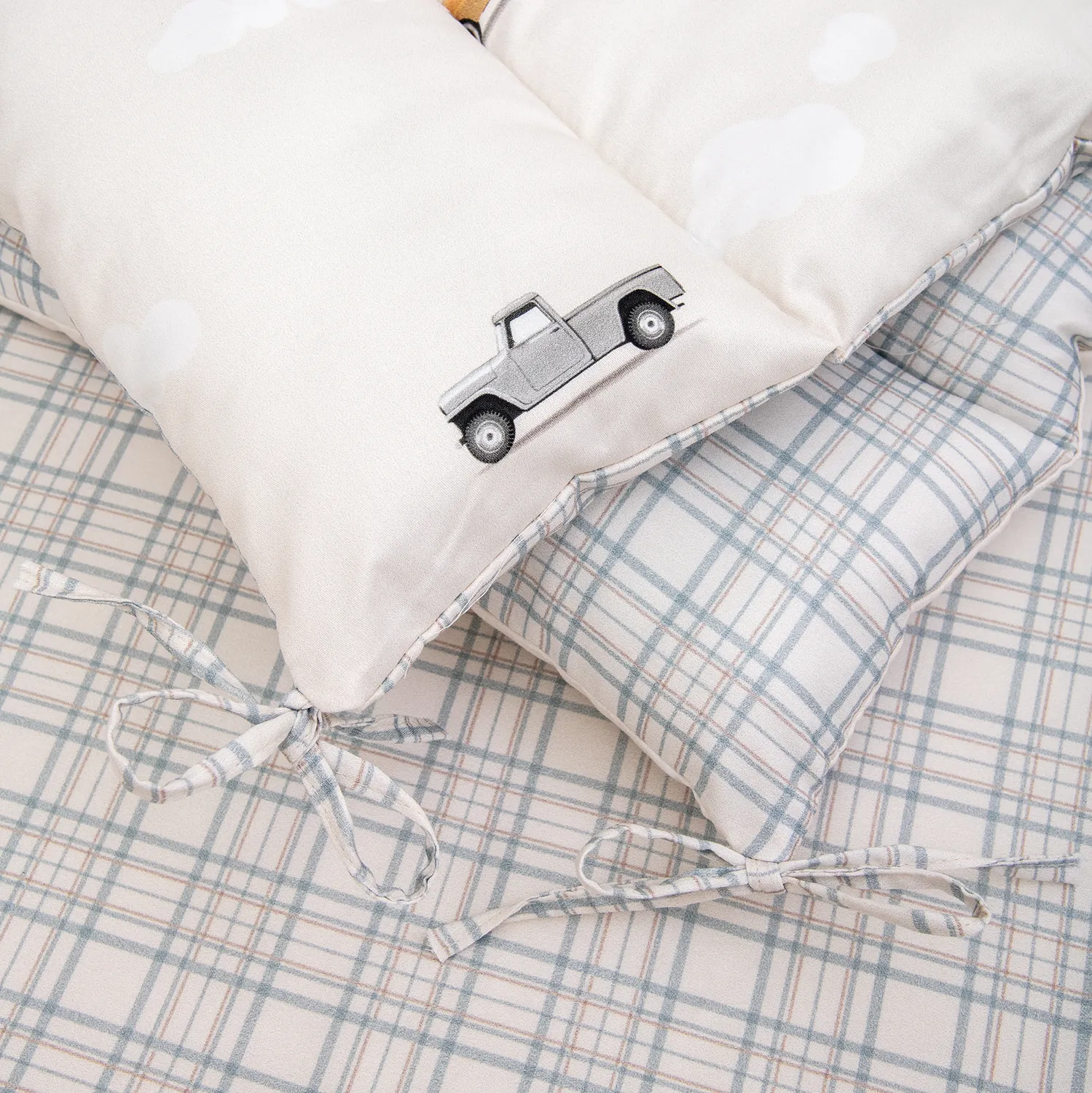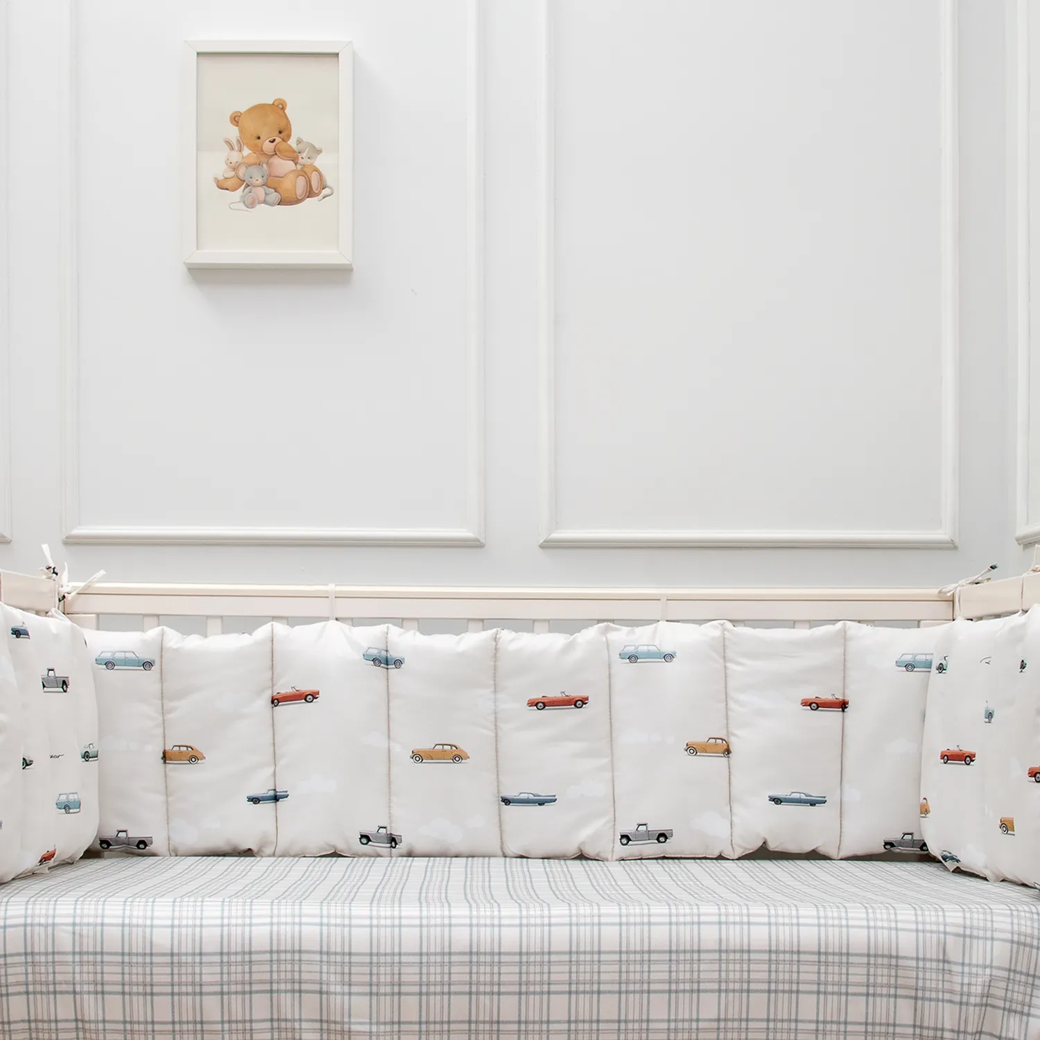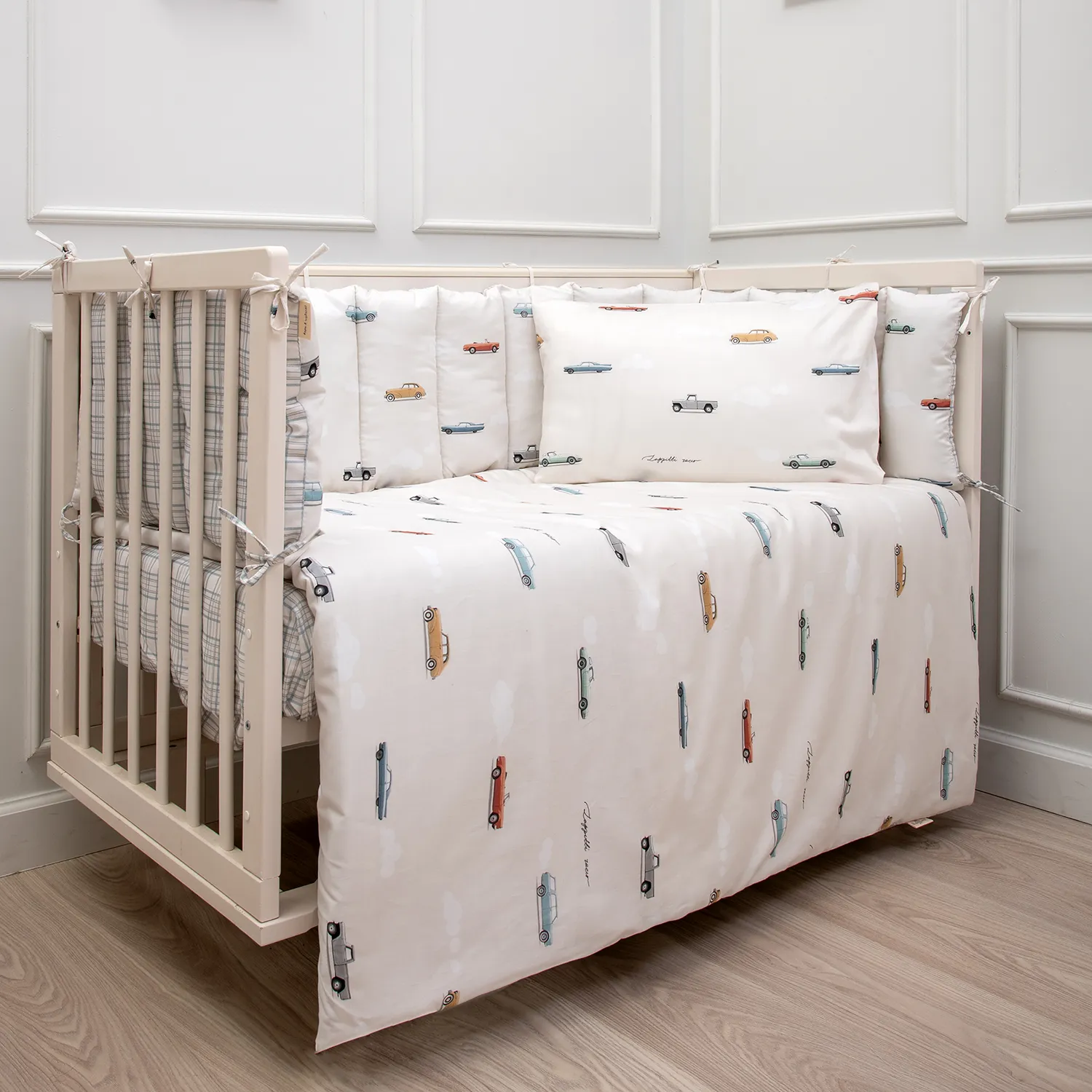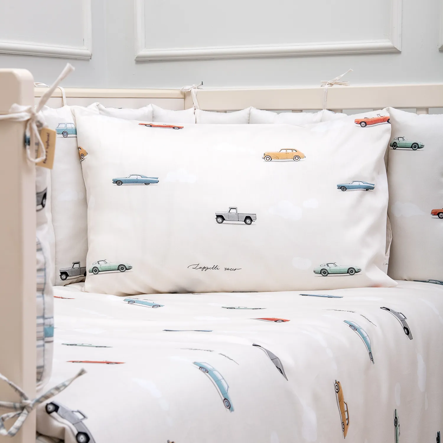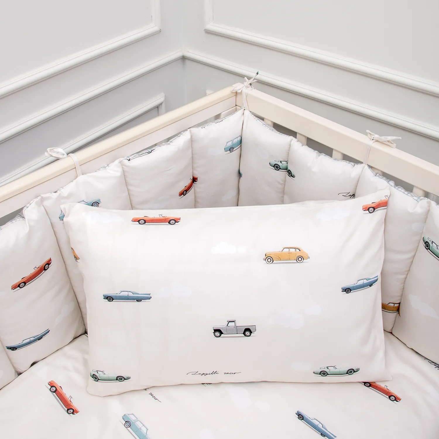 «Маленький гонщик» — коллекция для тех, кто даже во сне мчит навстречу приключениям! Винтажные автомобили, мягкие облака и спокойные оттенки создают атмосферу уюта и мечтательной дороги. Это не просто постельное бельё — это целый мир фантазии для маленького водителя. Комплект выполнен из премиального сатина (100% хлопок) — мягкого, дышащего и нежного к детской коже. Сдержанный дизайн, чистые линии и деликатная цветовая палитра подойдут для тех, кто ценит эстетику сканди. Всё продумано до мелочей — от формы облаков до плавных силуэтов ретро-машинок. «Маленький гонщик — путь ко сну начинается на старте мечты!» Особенность данного комплекта – это простеганные бортики на 4 стороны кроватки. Благодаря своей мягкости данный тип бортиков удобен в использовании в различных вариациях. В состав комплекта входят: Бортик из 4 частей 360*34cм, чехлы несъемные, наполнитель xоллкон, 500гр/м2 Пододеяльник - размер 146*112см Наволочка - размер 60*40см Одеяло - размер 142*110см (чехол 100% хлопок, наполнитель – бамбук 40%, холлкон (ПЭ 60%) Подушка-размер 60х40см (чехол 100% хлопок, наполнитель – бамбук 40%, холлкон (ПЭ 60 %) Простыня на резинке на матрас размера 120*60см. Ткань: сатин 100% хлопок