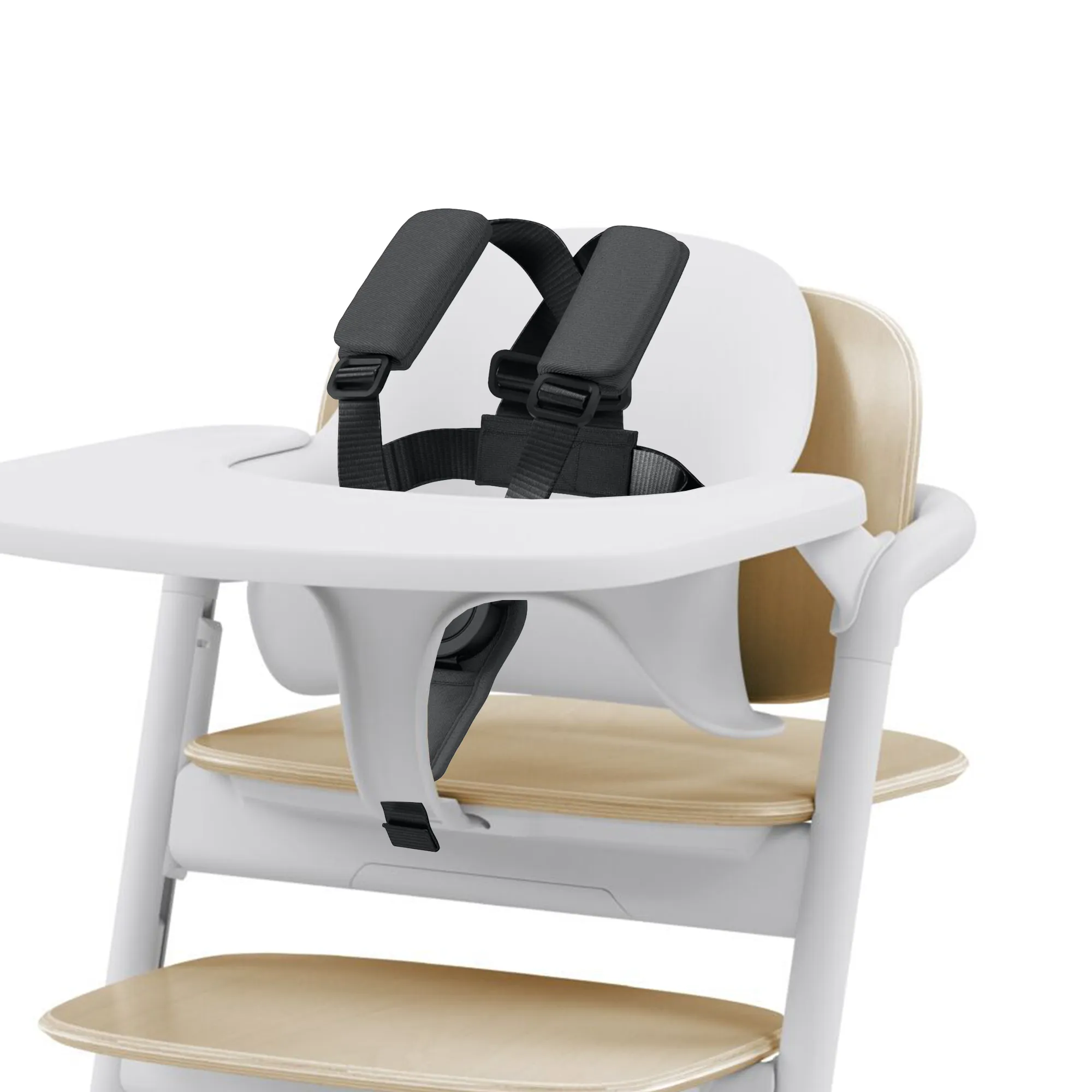 Система ремней обеспечивает дополнительную безопасность, когда ваш ребенок сидит в детском кресле, установленном на высоком стульчике Lemo или Click & Fold.