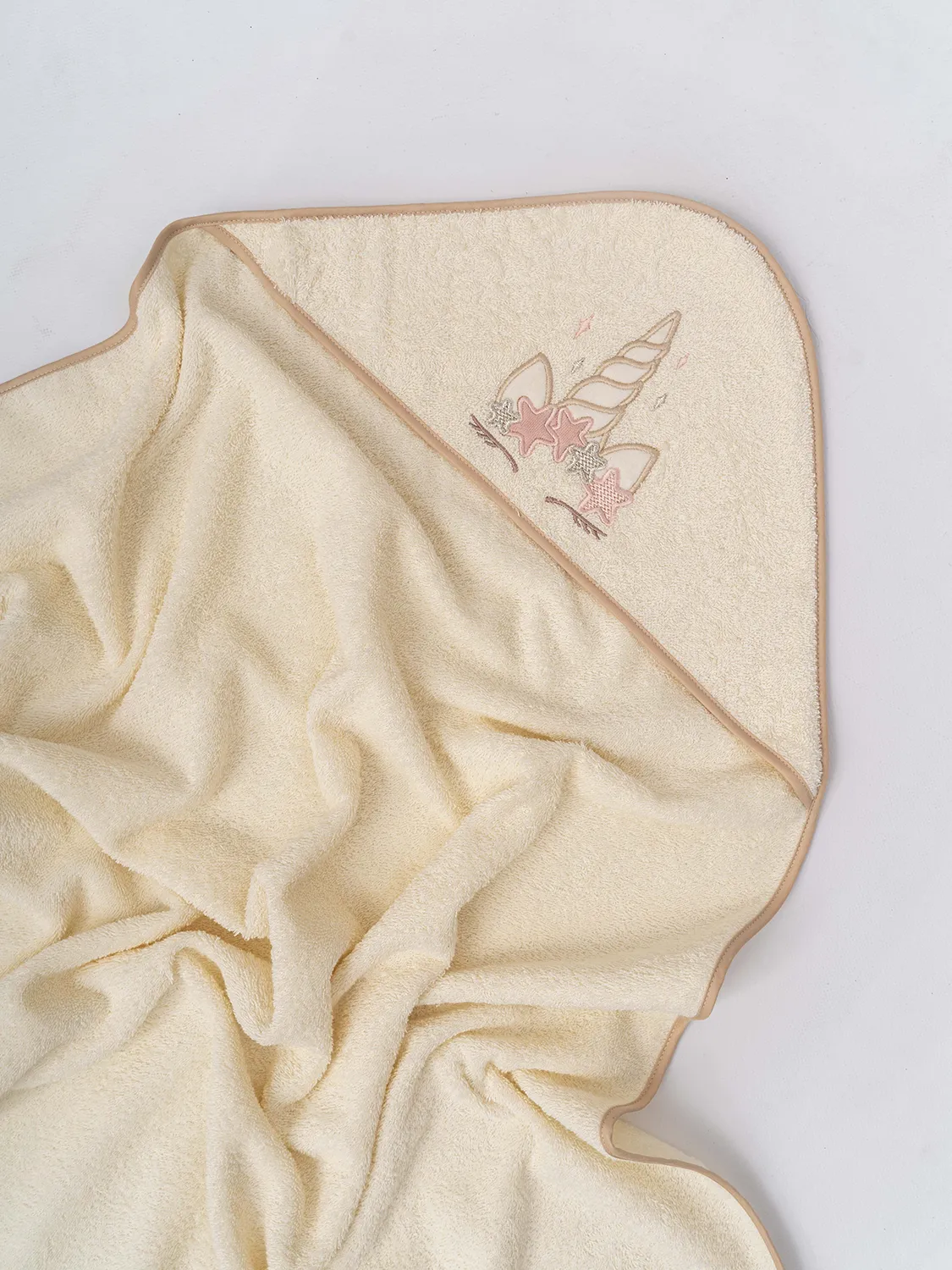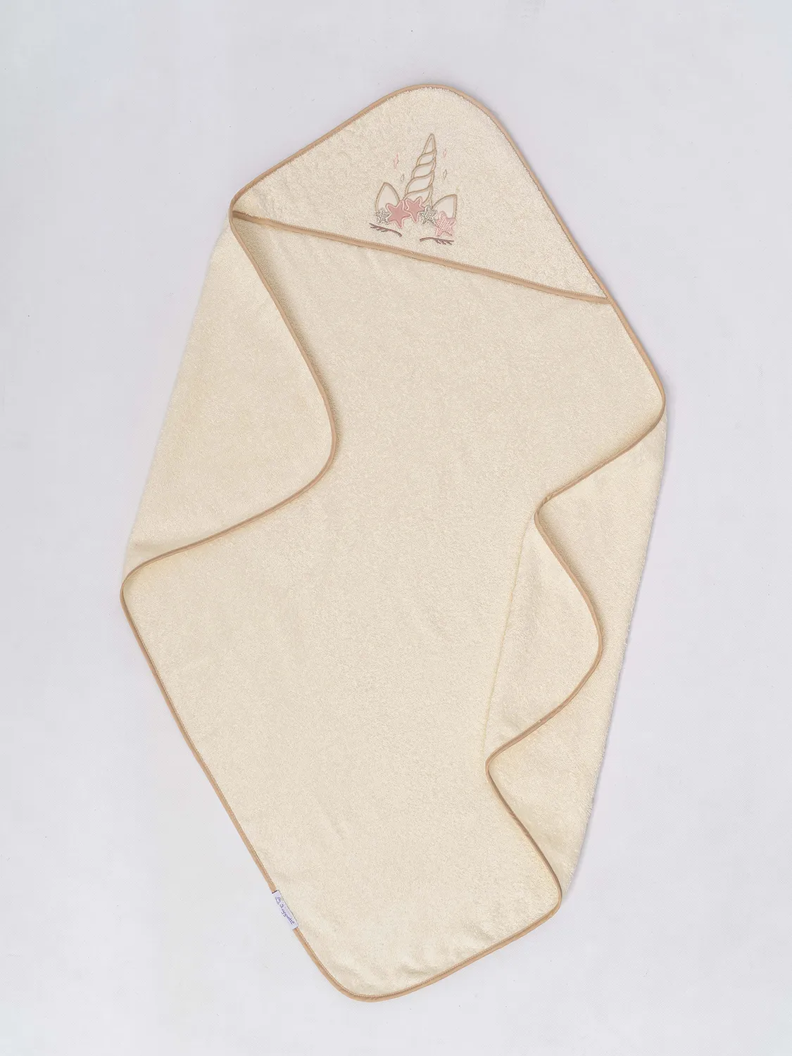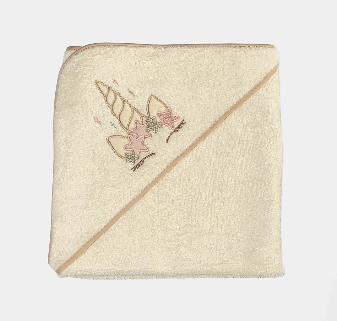 Состав: махровое полотно, 100% хлопок. Окантовка - сатин, 100% хлопок Размер: 100х73 см. Капюшон украшен вышивкой в виде рога единорога.