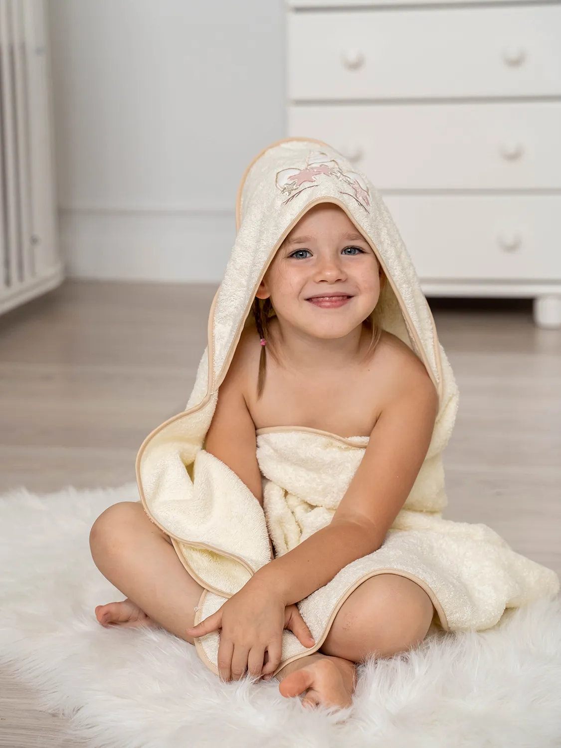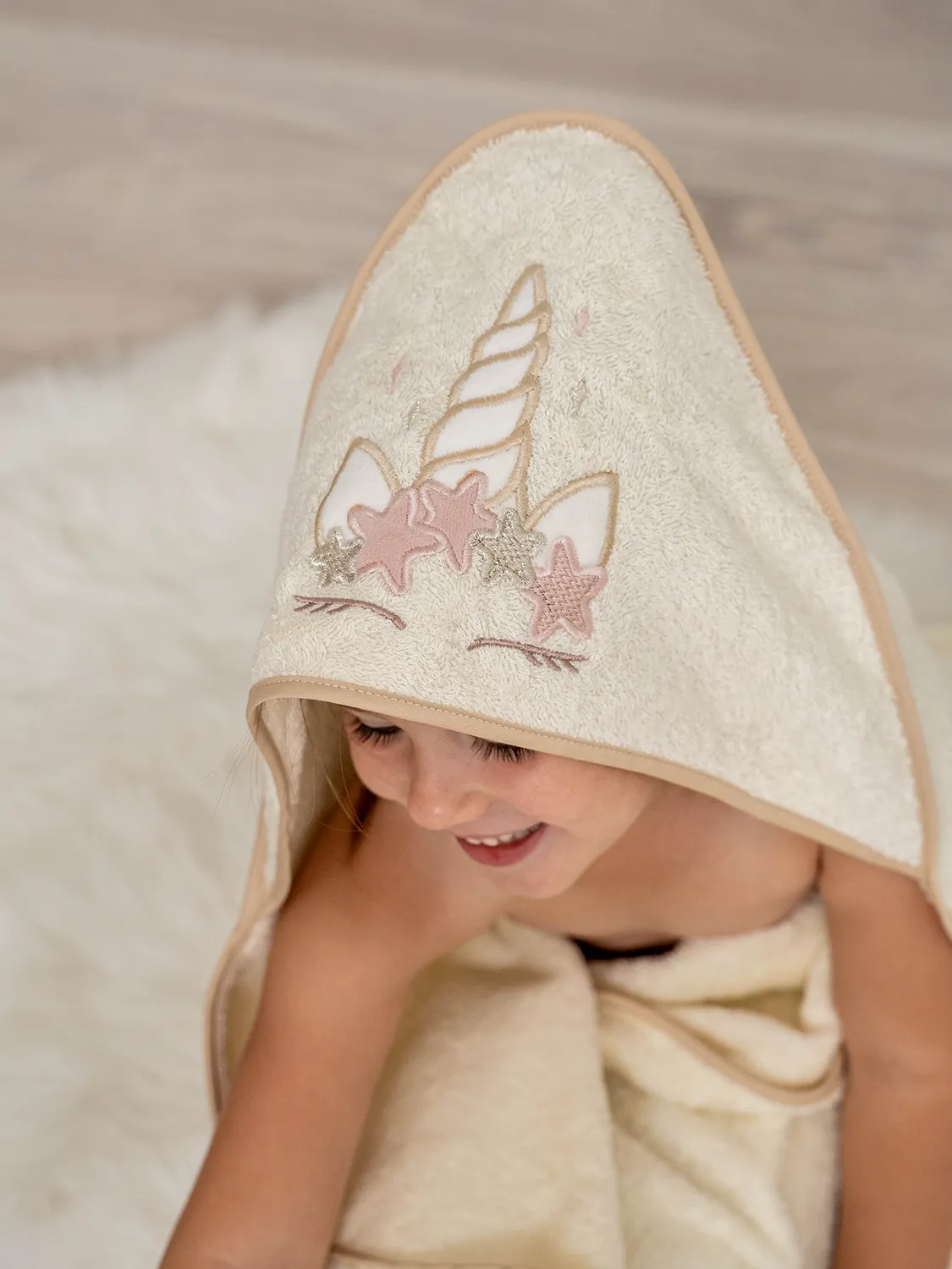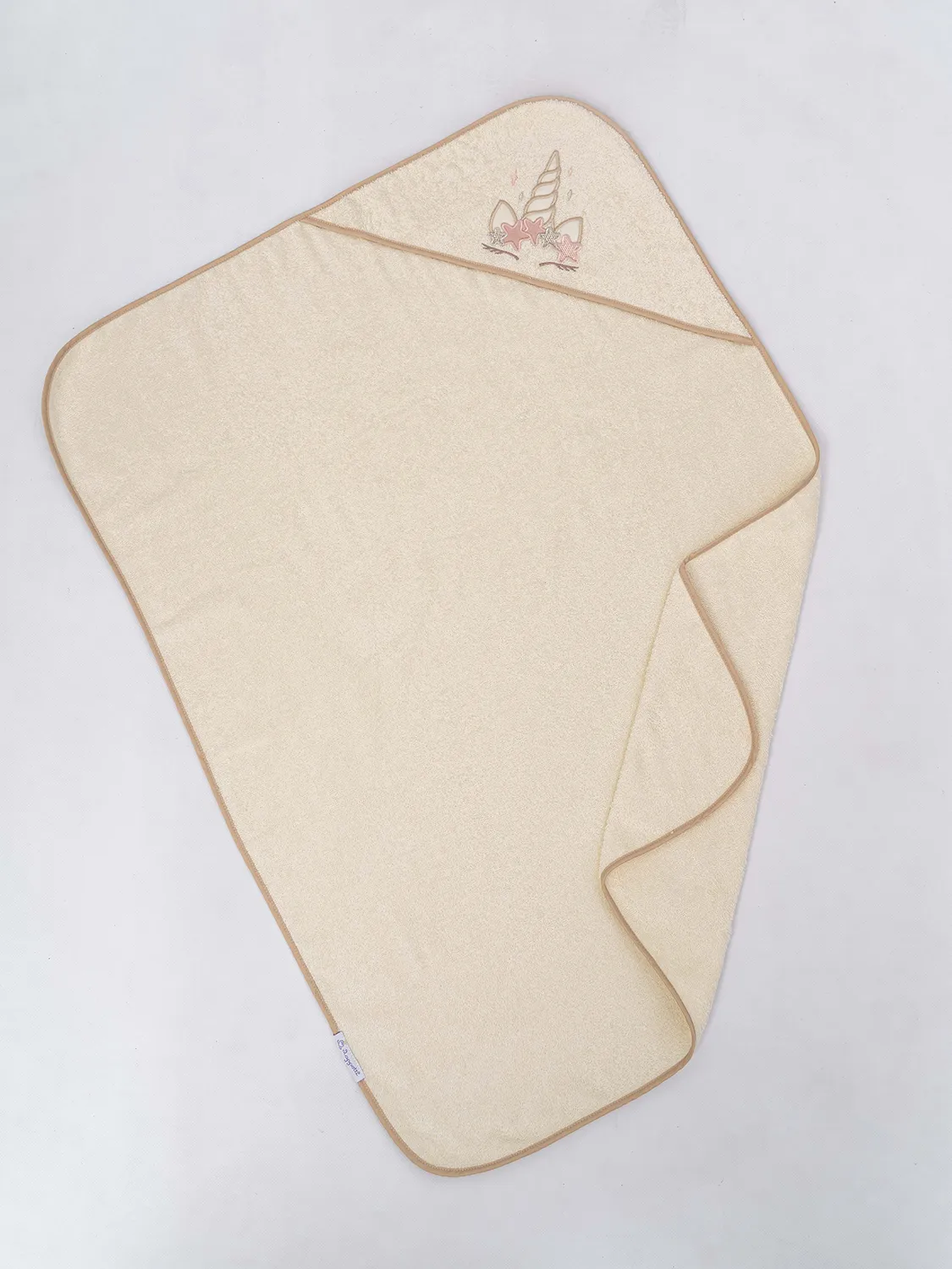 Состав: махровое полотно, 100% хлопок. Окантовка - сатин, 100% хлопок Размер: 100х73 см. Капюшон украшен вышивкой в виде рога единорога.