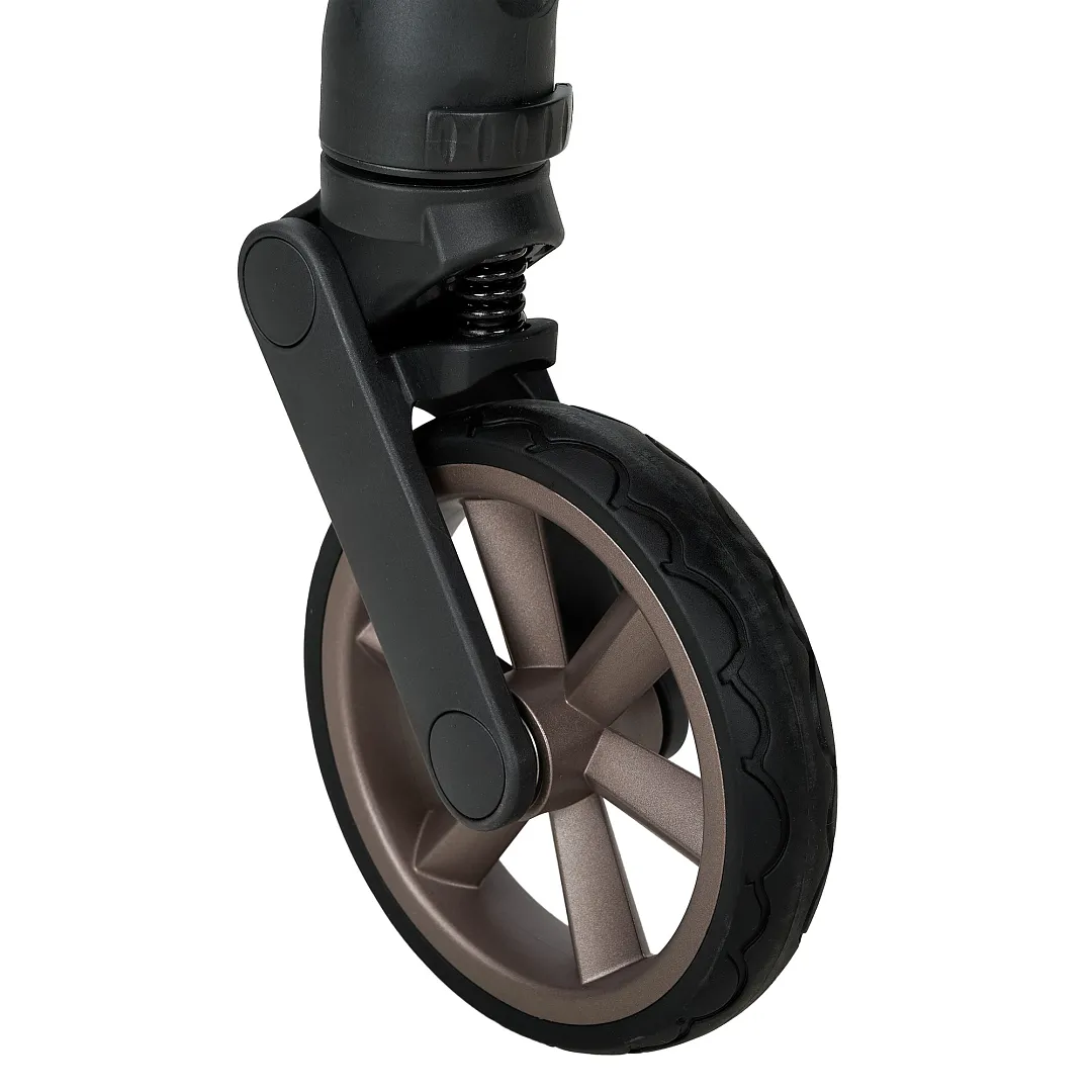 • Отличная маневренность и плавность хода. Шасси имеет мягкую подвеску и шариковые подшипники на каждом колесе. Задние колеса диаметром 15 см. Передние колеса диаметром 13см с амортизацией и функцией блокировки.