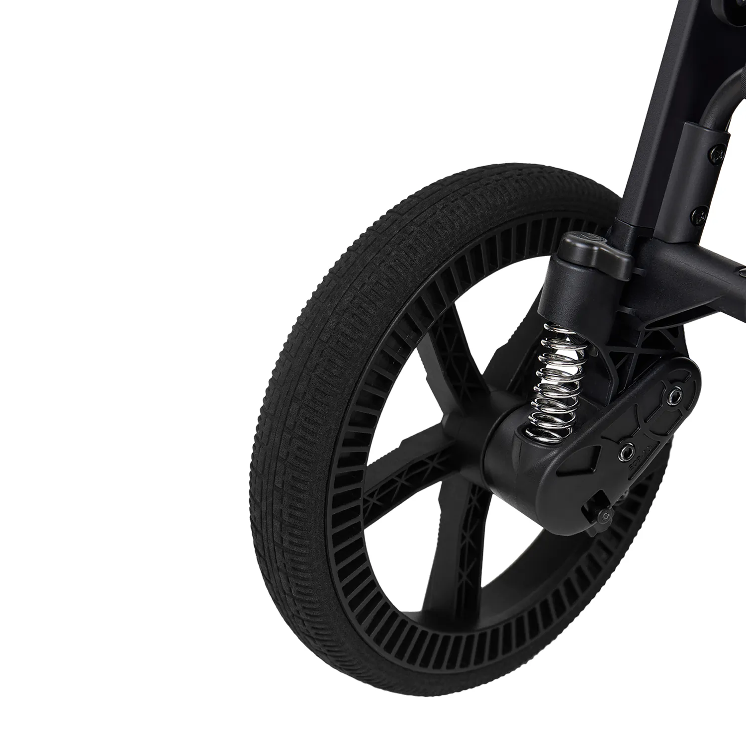Новые интонационные колеса из высокомолекулярного сшитого полимера с регулируемой подвеской обеспечивают мягкую и комфортную прогулку как в городе, так и на природе. Передние колеса поворотные с функцией фиксации обеспечат отличную маневренность.