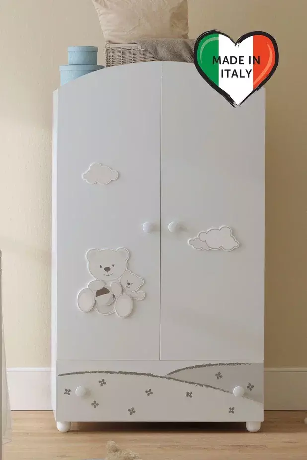 Шкаф Daisy изготовлен из бука. Внутри он разделен на две секции: слева есть две передвижные полки, а справа предусмотрена подвесная планка, покрытая нетоксичной краской на водной основе. Простой, но функциональный шкаф Pali оснащен двумя большими дверцами и комодом, что позволяет разместить в нём все необходимое для вашего малыша.