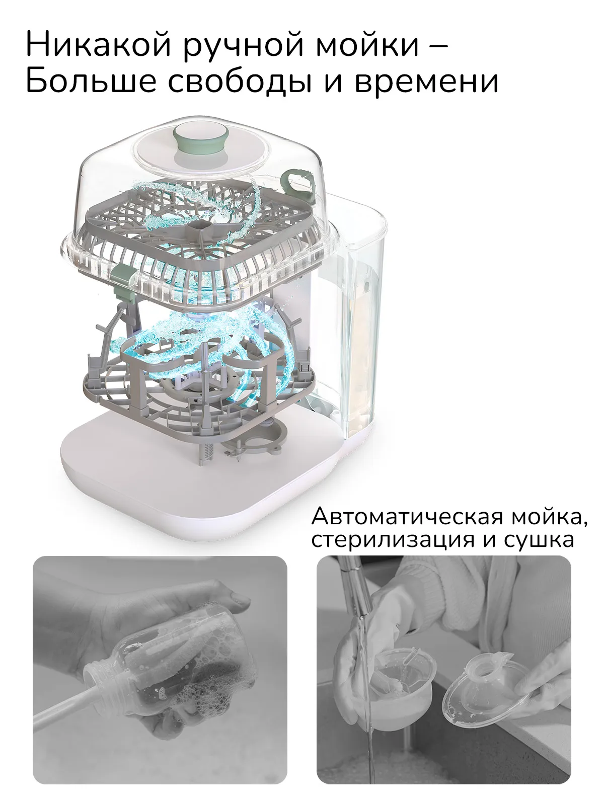 Специальная система струй тщательно очищает внутреннюю поверхность бутылочек, а вращающиеся потоки воды аккуратно удаляют загрязнения снаружи, обеспечивая полную чистоту каждого предмета.
