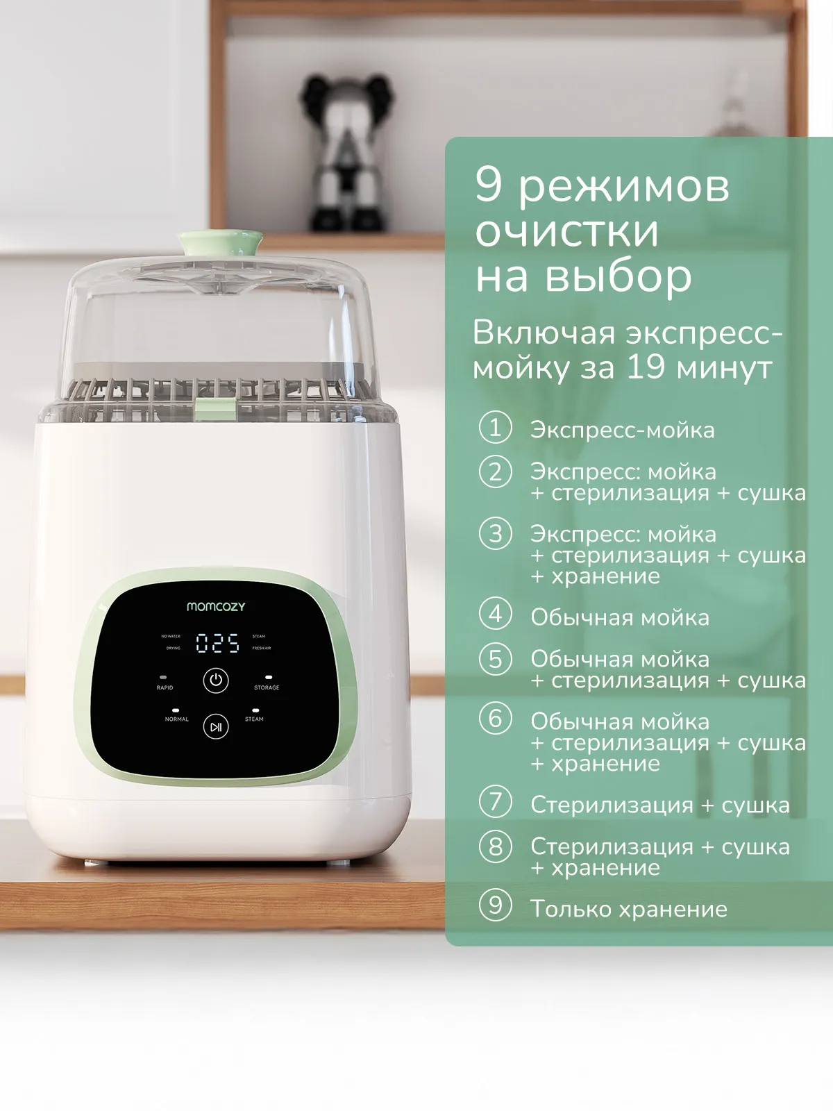 Возможность комбинировать четыре режима (быстрая мойка, обычная мойка, стерилизация с сушкой, хранение) и настроить устройство под свои потребности делает процесс использования максимально комфортным. В спешке используйте режим Quick Wash — всего 19 минут для полной очистки.